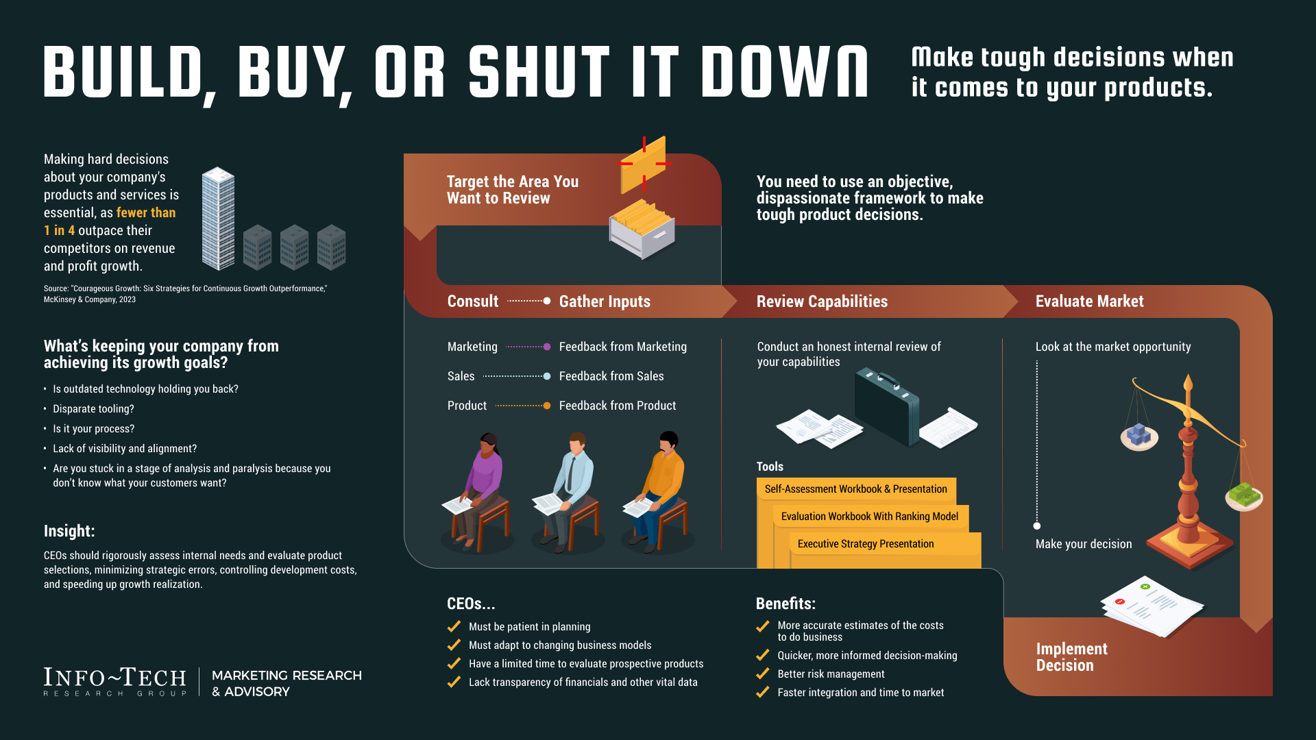 Info-Tech's methodology for Build, Buy, or Shut It Down
