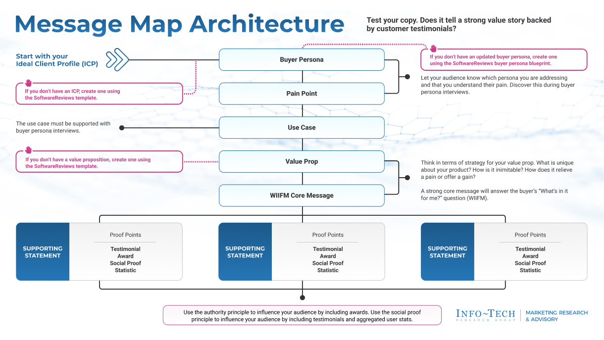 Our research finds that leading content marketers craft messaging that lets their audience ”know they know them,” points out what’s in it for them, and includes proof points of promised value. This simple, yet often missed approach, we call Message Mapping, which helps marketers grab a visitor’s initial attention and when applied throughout the customer journey will turn prospects into customers, lifelong buyers, advocates, and referrals.